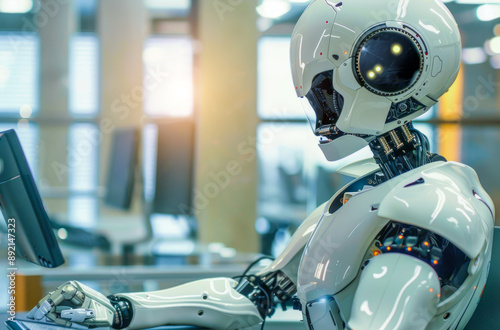 A robot working in the office. Robot artificial intelligence AI takeover. Job replacement