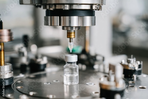A robotic arm carefully fills sterile vials with liquid in a clean and advanced laboratory. The process ensures precision and maintains high safety standards for pharmaceutical production
