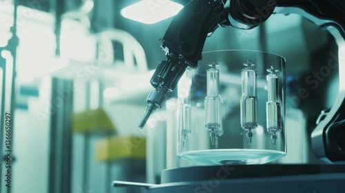 A robotic arm in a biotechnology factory, assembling bioreactors with AI precision for pharmaceutical production, Pharma-tech style