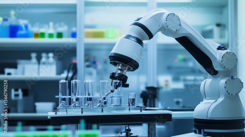 A robotic arm in a high tech scientific research lab, assembling complex laboratory equipment with AI precision for chemical analysis, Science-tech style