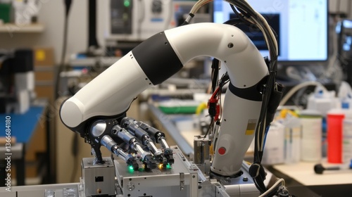 A robotic arm in a medical lab, assembling high-precision surgical robots for minimally invasive procedures, Med-tech style