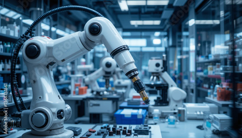 A robotic arm meticulously handling a sample in a high-tech laboratory, showcasing precision and innovation with cool blue tones and sharp focus.