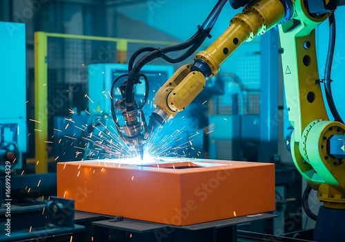 A robotic arm performs precision welding on a metal part in a modern factory setting, showcasing the precision and efficiency of automated manufacturing.