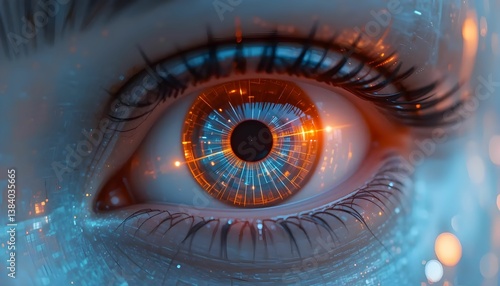 A robotic eye scanning digital data, hyper-realistic reflections of futuristic city lights within the iris