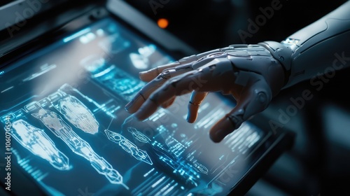 A robotic hand interacts with a digital interface, showcasing futuristic technology.