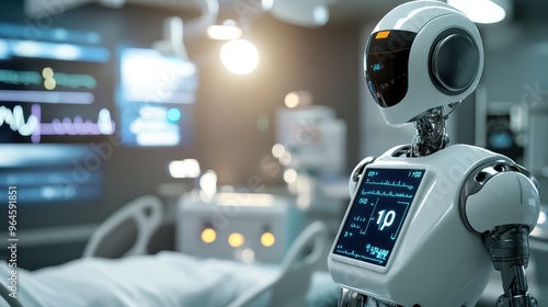 A robotic nurse monitoring a patient's vital signs, focus on the digital display, blurred medical facility in the background, bright lighting.