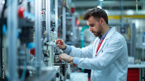 A robotics engineer in a lab coat with a red ID lanyard calibrating machinery in a high-tech workspace