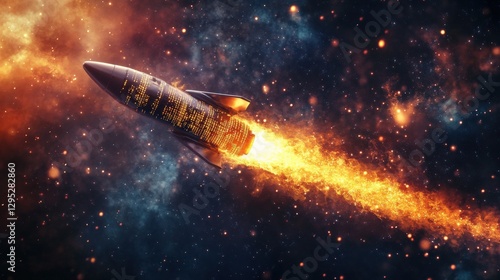 A rocket blasting off into space, leaving a trail of golden blockchain codes, symbolizing the fusion of technology and space exploration.