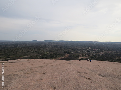 A rocky and desert like landscape at Enchanted Rock State Park in Texas.