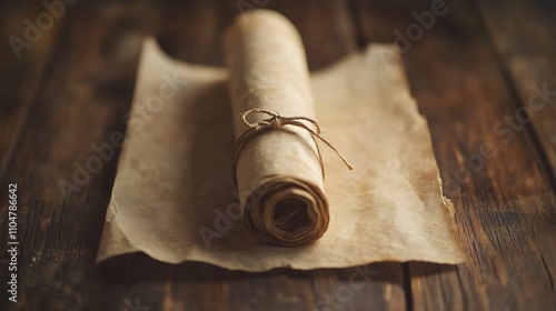 A rolled-up piece of parchment paper tied with a string, resting on a wooden table