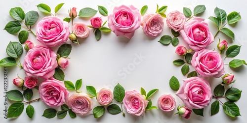 A romantic flat lay showcases a pink rose floral frame on a white backdrop, photographed with low light for a soft, intimate feel.