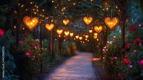 A romantic path lined with rose bushes and heart-shaped lanterns glowing in the evening