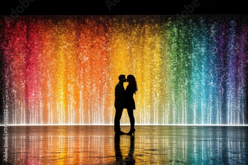 A romantic silhouette of a couple sharing a kiss against a vibrant, multicolored water backdrop, creating a magical atmosphere.