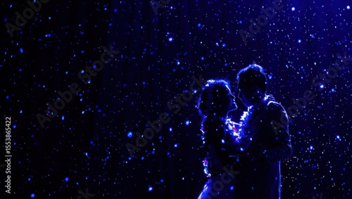 A Romantic Silhouette of Two Lovers Dancing Under a Starry Night Sky with Glimmering Lights Creating an Enchanting Atmosphere