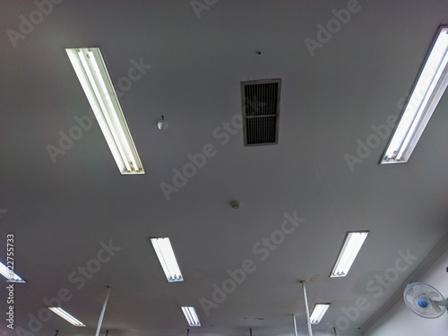 A room illuminated by numerous ceiling-mounted lights creates a bright and inviting atmosphere. The round, white lights are evenly distributed across the space.