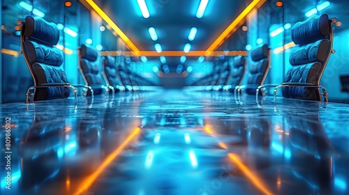 A room with blue walls and orange lights