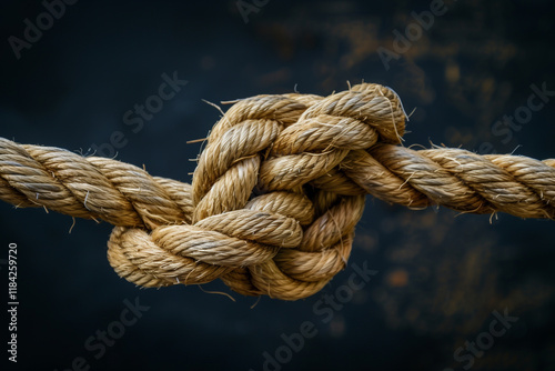 A rope tied in a knot, its rough fibers contrasting with the smooth, dark background.