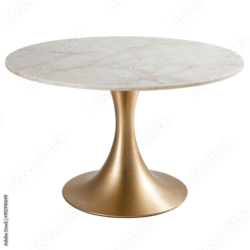 A round dining table with a white marble top and a gold base. Perfect for modern or minimalist dining rooms, kitchens, or restaurants.