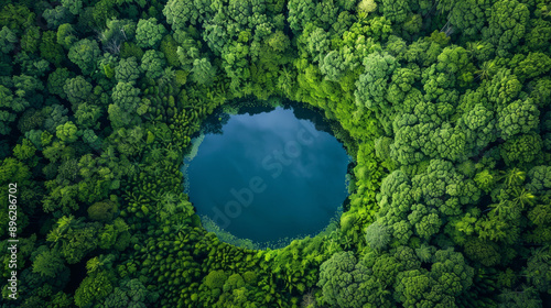 A round lake seen from above looks like a mini Earth, with green trees all around.