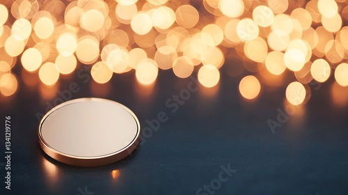 A round mirror lies on a dark surface, surrounded by a soft glow of out-of-focus warm lights in the background, creating a dreamy atmosphere.