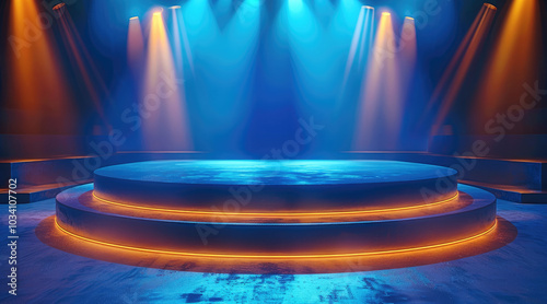 A round stage illuminated by gentle, warm lights, with a blurred blue background providing a serene and elegant contrast. The warm glow creates a spotlight effect on the stage.