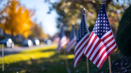 A row of American flags are standing upright in a field. The flags are all red and white, and they are all facing the same direction. The scene is peaceful and patriotic. AI generated.