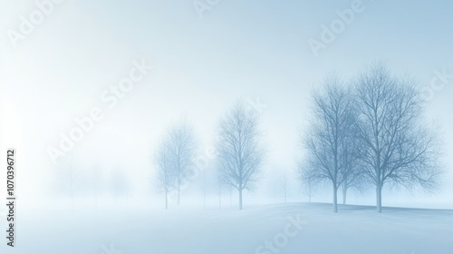 A row of bare trees stand silhouetted against a hazy, blue sky. The landscape is shrouded in mist, creating a sense of mystery and tranquility.