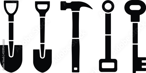 A row of black silhouette icons showing two shovels a hammer a wrench and a key on a white background