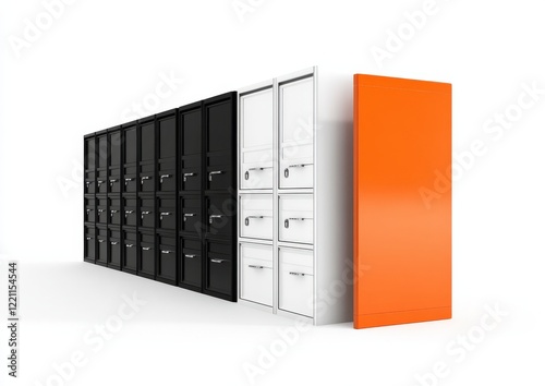 A row of black, white, and orange binders on a white background
