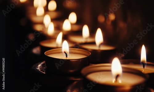A row of candles are lit up in a dark room. The candles are arranged in a line, with some of them being taller than others. The candles are lit up and give off a warm, cozy glow. The scene is peaceful