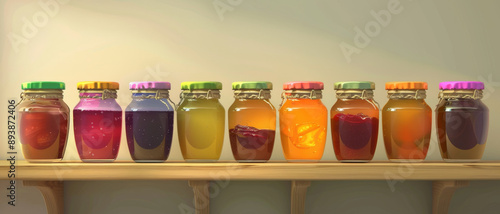 A row of colorful jars filled with a variety of preserved foods sits neatly on a wooden shelf, casting a nostalgic and inviting glow.