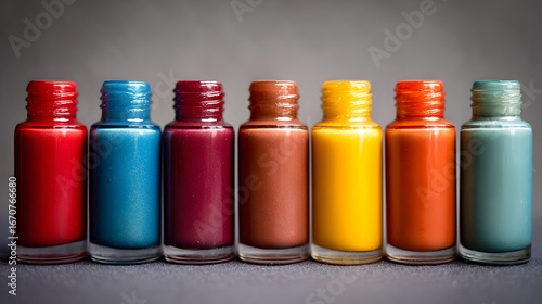 A row of colorful nail polish bottles arranged in a spectrum of vibrant hues against a muted gray backdrop.