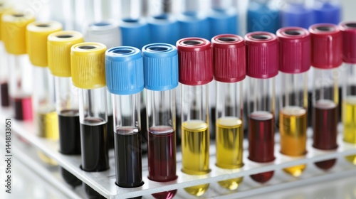 A row of colorful test tubes with various liquids in them, arranged on a laboratory tray.