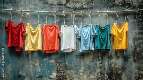 A row of colorful t-shirts hanging on a rope against a textured wall, with a wooden floor in the foreground.