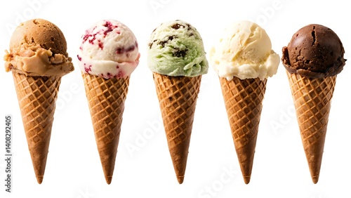 A row of five ice cream cones with different flavors against a stark white background in a studio shot