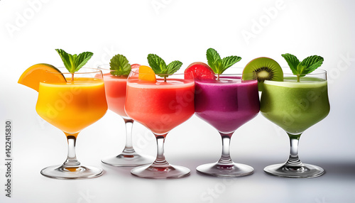 A row of five tall glasses filled with fruit juice.