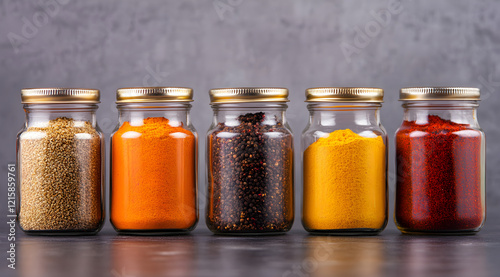 A row of glass jars filled with various colorful spices, showcasing a vibrant display of textures and hues against a neutral background.
