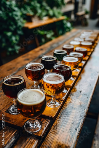 A row of glasses of beer sitting on top of a wooden table