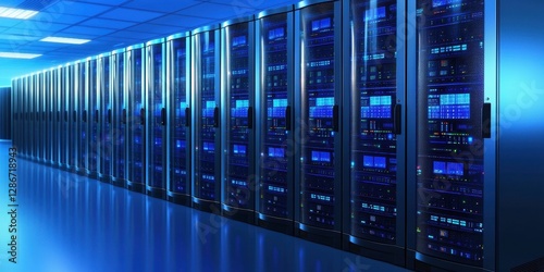 A row of illuminated server racks in a data center, showcasing blue lights and a sleek, modern design.
