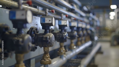 A row of industrial machinery with gauges and pipes. AI.
