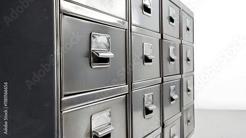 A row of metal drawers with silver handles
