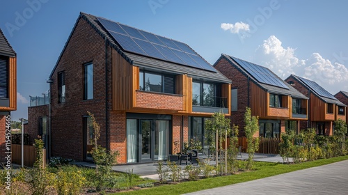 A row of modern energy-efficient terraced houses with solar panels on the roof, standing under a clear, sunny sky. T