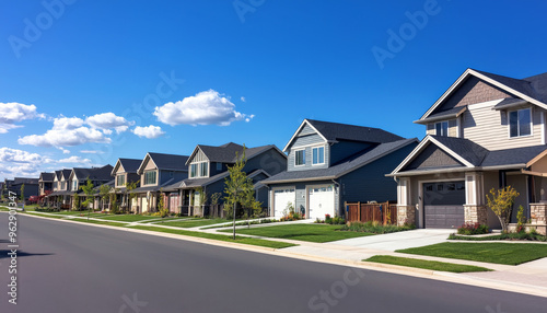 A row of modern suburban houses along a quiet street under a clear blue sky with fluffy clouds.