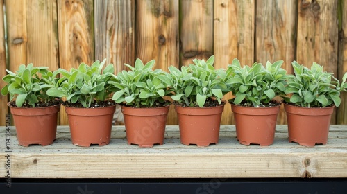 A row of potted plants sitting on top of a wooden table