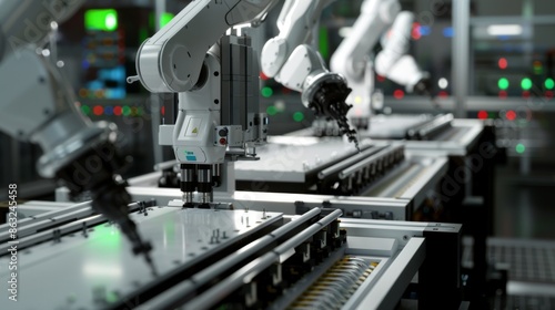 A row of robotic arms work in a factory setting, assembling products on a conveyor belt.