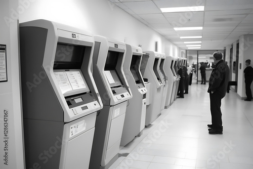 A row of self-service kiosks lines a brightly lit hallway where people are waiting. The photo is black and white, which gives it a neutral, timeless, and sterile feel.