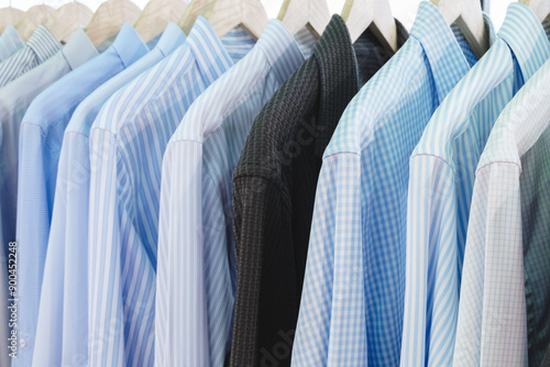 A row of shirts are hanging on a clothesline, with some being blue and some being white