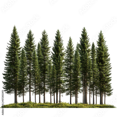 A row of tall evergreen trees with lush green foliage and a grassy foreground isolated on transparent background