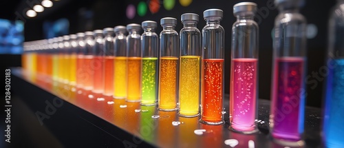 A row of test tubes with colorful liquids, showcasing bright, vibrant hues in a laboratory setting