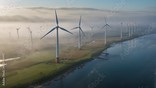 A row of wind turbines are lined up along a river. The wind turbines are tall and spread out, with some of them being closer to the water and others further away. The scene is peaceful and serene